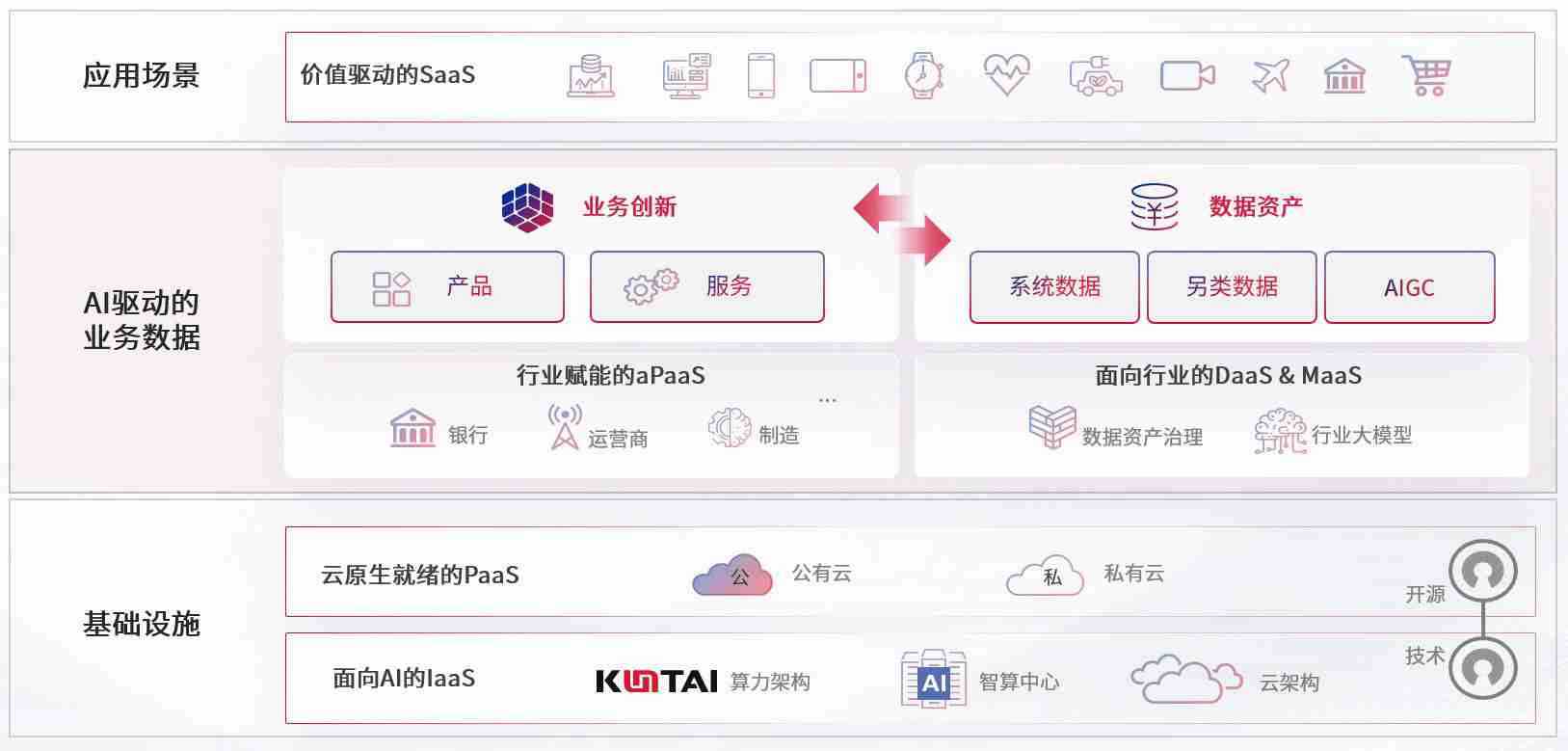 数字时代,,围绕企业数字化转型的关键要素,,KY开元数码开创性的提出数云融合战略和技术体系框架,,,,着力在云原生、、、、数字原生、、、AI原生和信创产业上架构产品和服务能力,,,为处在不同数字化转型阶段的快消零售、、汽车、、金融、、、、医疗、、、、政企、、、教育、、、运营商等行业客户提供泛在的敏捷IT能力和融合的数据驱动能力,,,,构建跨界融合创新的数字业务场景和新业务模式,,助力企业级客户建立面向未来的核心能力和竞争优势,,,,全面推动社会的数字化、、、、智能化转型升级。。。。